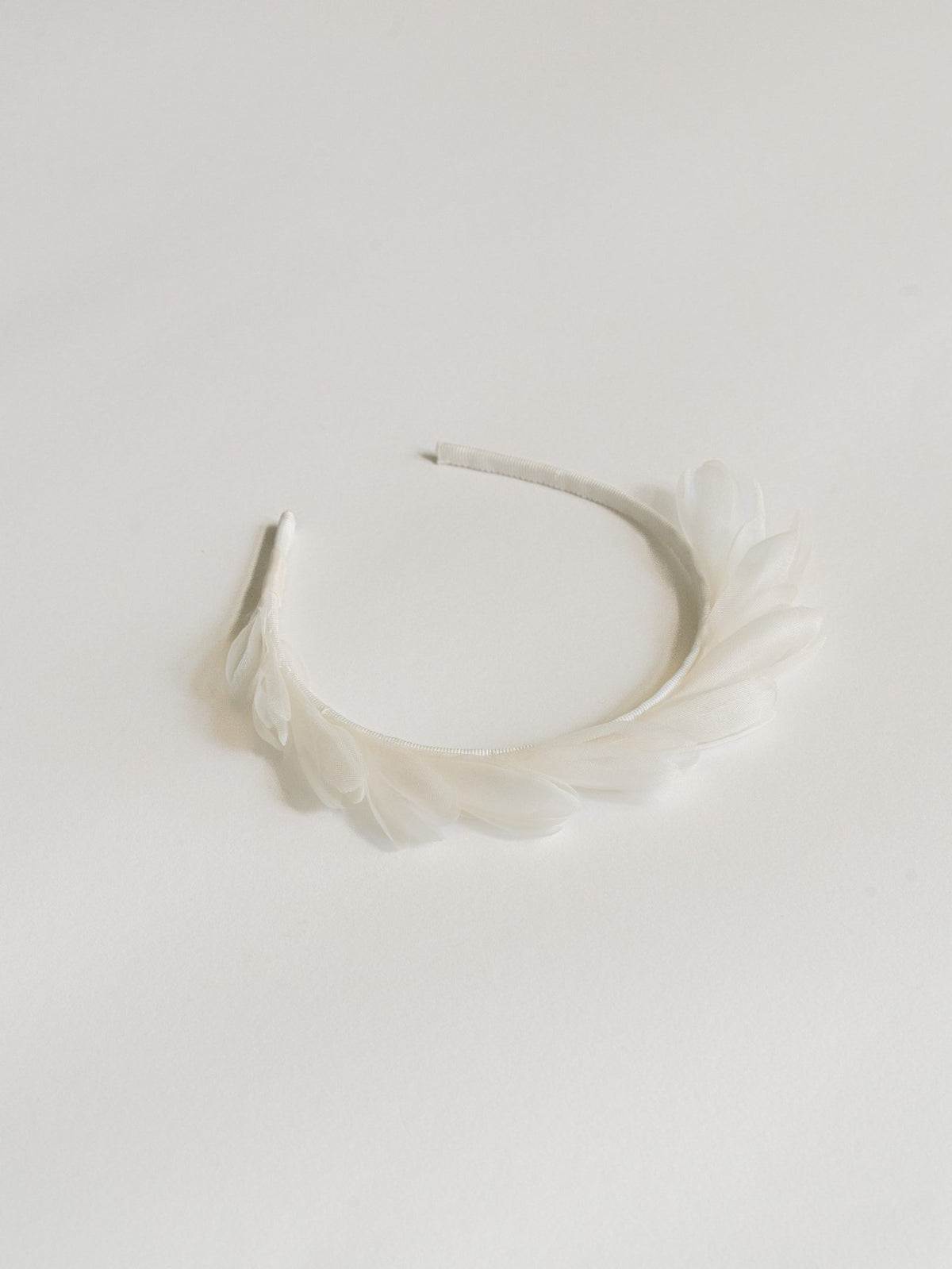 Dieser dezente Kopfschmuck passt hervorragend zu langen und zu kurzen Haaren. Es stehen drei Farben zur Auswahl. Jedes Blütenblatt wird von Hand an einem mit weißem Satin umwickelten, flexiblen Haarreif sorgfältig vernäht.