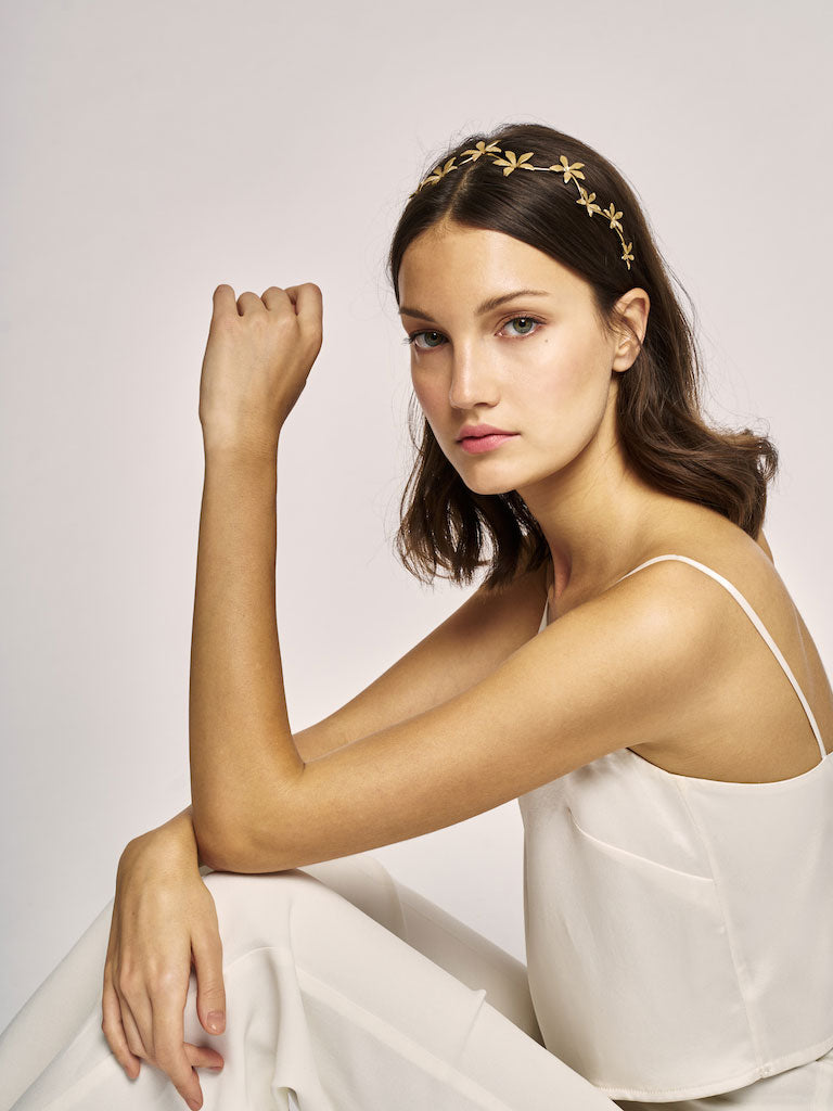 Dieses atemberaubende Haarband ist mit metallenen Sternen-Jasminblüten versehen. Es ist der perfekte Haarschmuck, der deine Hochzeitsfrisur vervollständigt, und es ist großartig für jeden weiteren eleganten Abend. Das Schmuckstück kann am Oberkopf oder als Rahmen für deine Hochsteckfrisur um den Hinterkopf getragen werden. Wenn du den Schmuck hinten tragen möchtest, kannst du ihn mit den mitgelieferten Bändern befestigen oder mit Haarnadeln in die Frisur stecken.