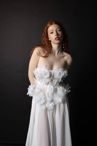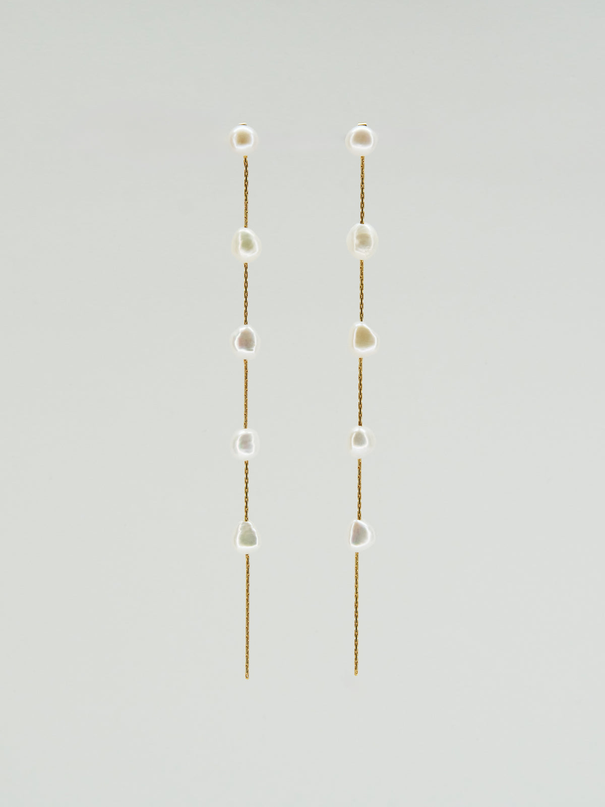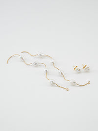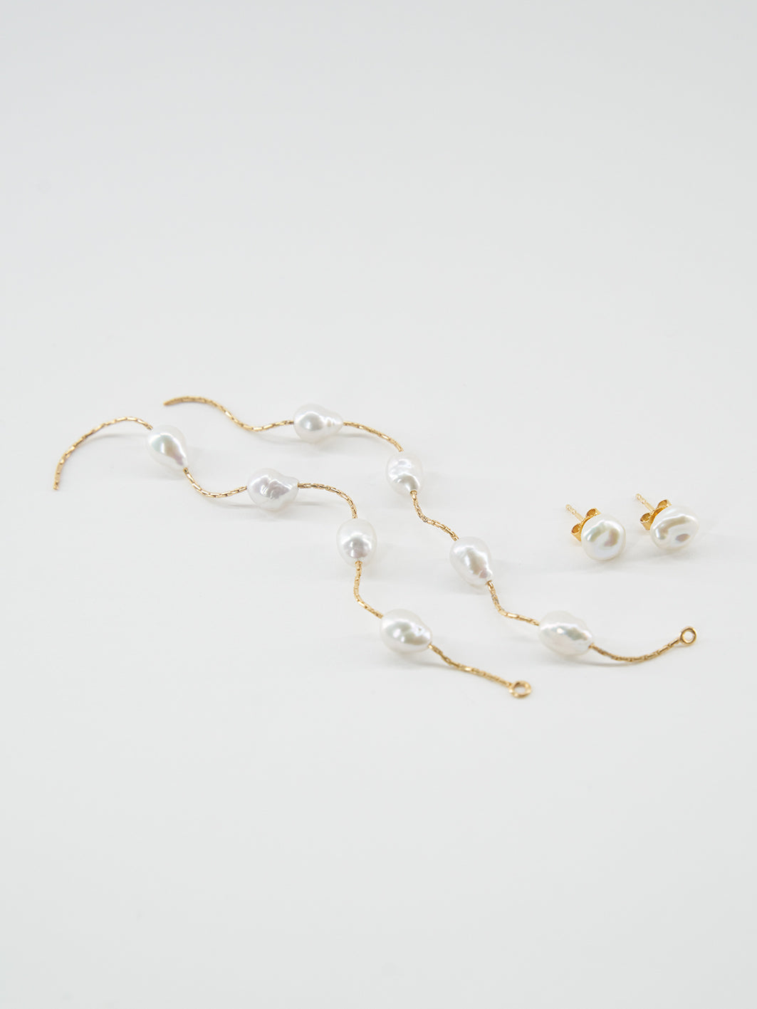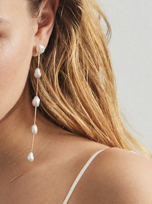 Die Süßwasserperlen fallen anmutig von zarten goldenen Strängen herab und bilden eine atemberaubende Silhouette, die das Schlüsselbein sanft umspielt. Dieses Schmuckstück ist vielseitig einsetzbar. Sie haben die Wahl zwischen einem dezenten Look mit dem schlichten Ohrstecker oder einem dramatischeren Auftritt mit dem zusätzlichen Perlenstrang.
