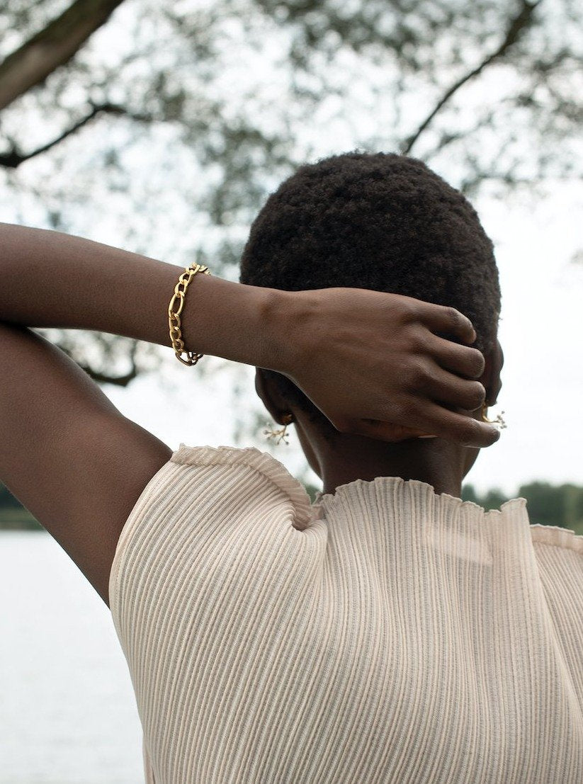 Dieses Statement-Armband besteht aus einer massiven Kette und ist mit einem T-Verschluss versehen. Es ist aus vergoldetem Messing gefertigt und besteht aus zwei Kettentypen mit kontrastierendem Design.