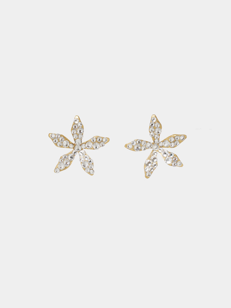 Zart und zurückhaltend. Diese Ohrstecker erinnern an zarte Jasminblüten. Jeder einzelne ist komplett mit Strass- Steinen besetzt. Diese Ohrringe passen perfekt zu unseren Ciel-Kopfschmuckstücken und könnten dein alltägliches Funkeln sein.